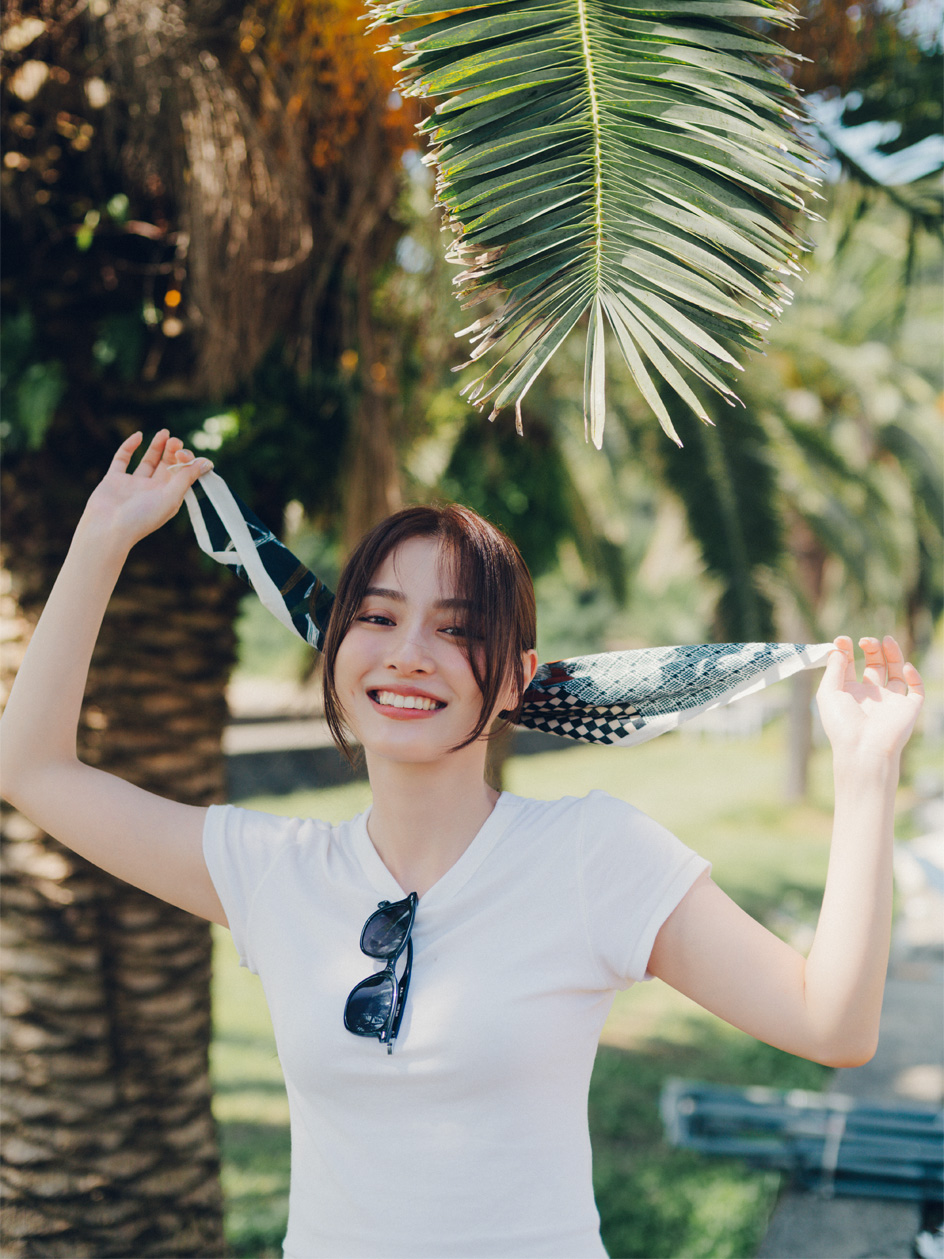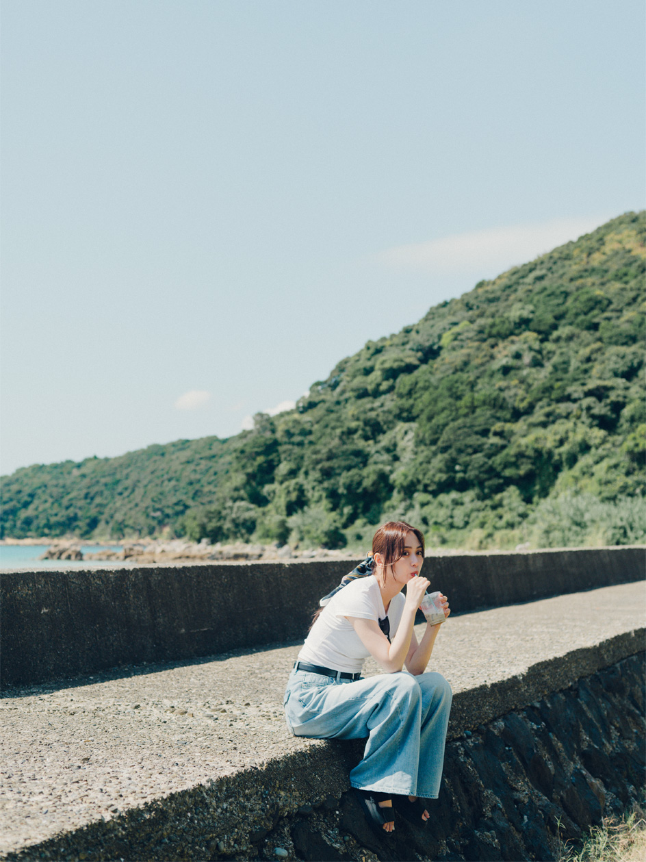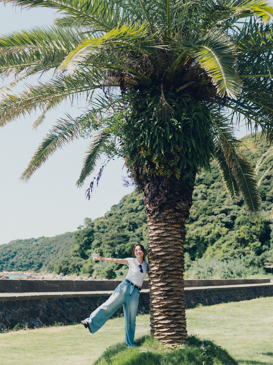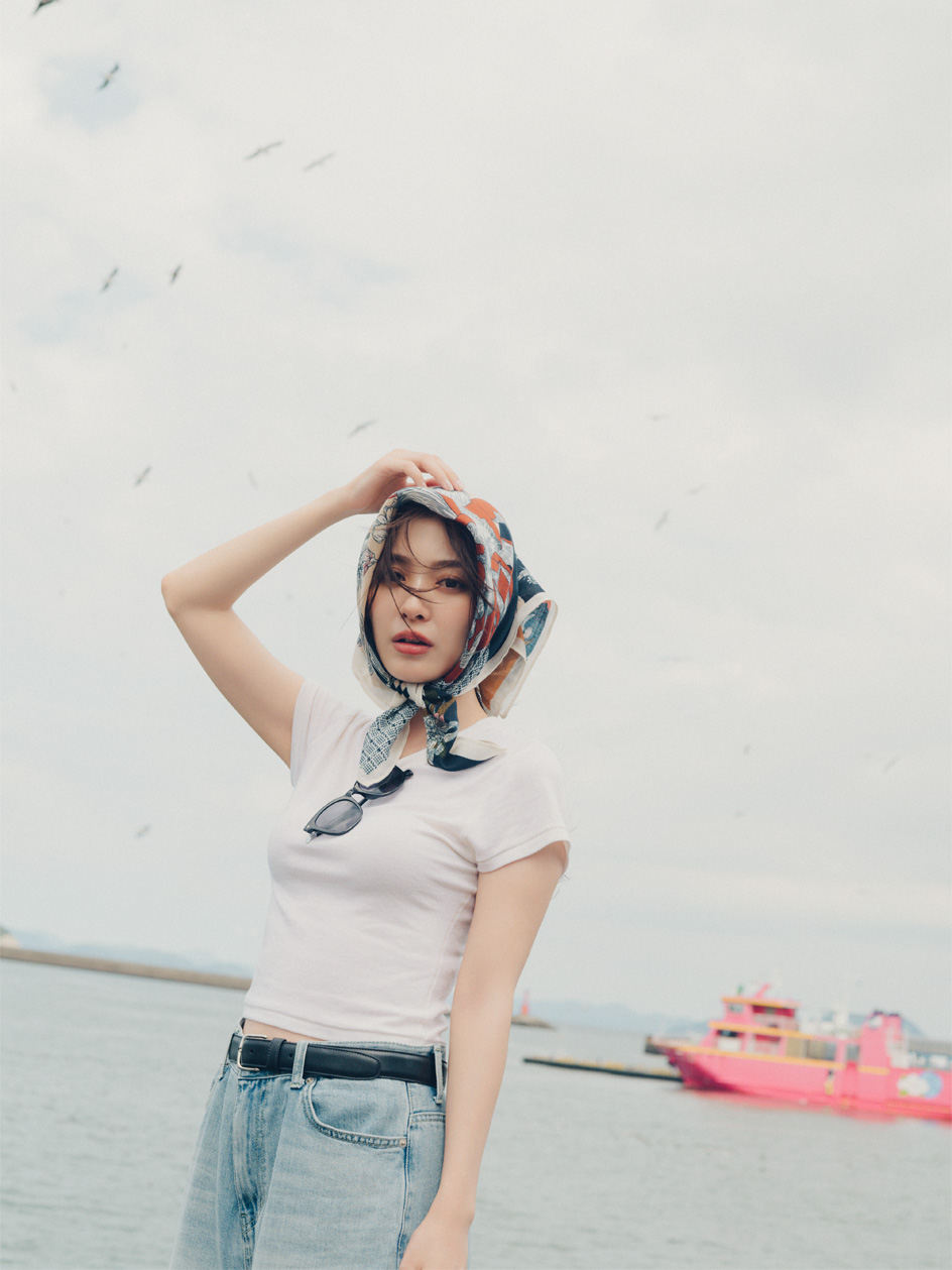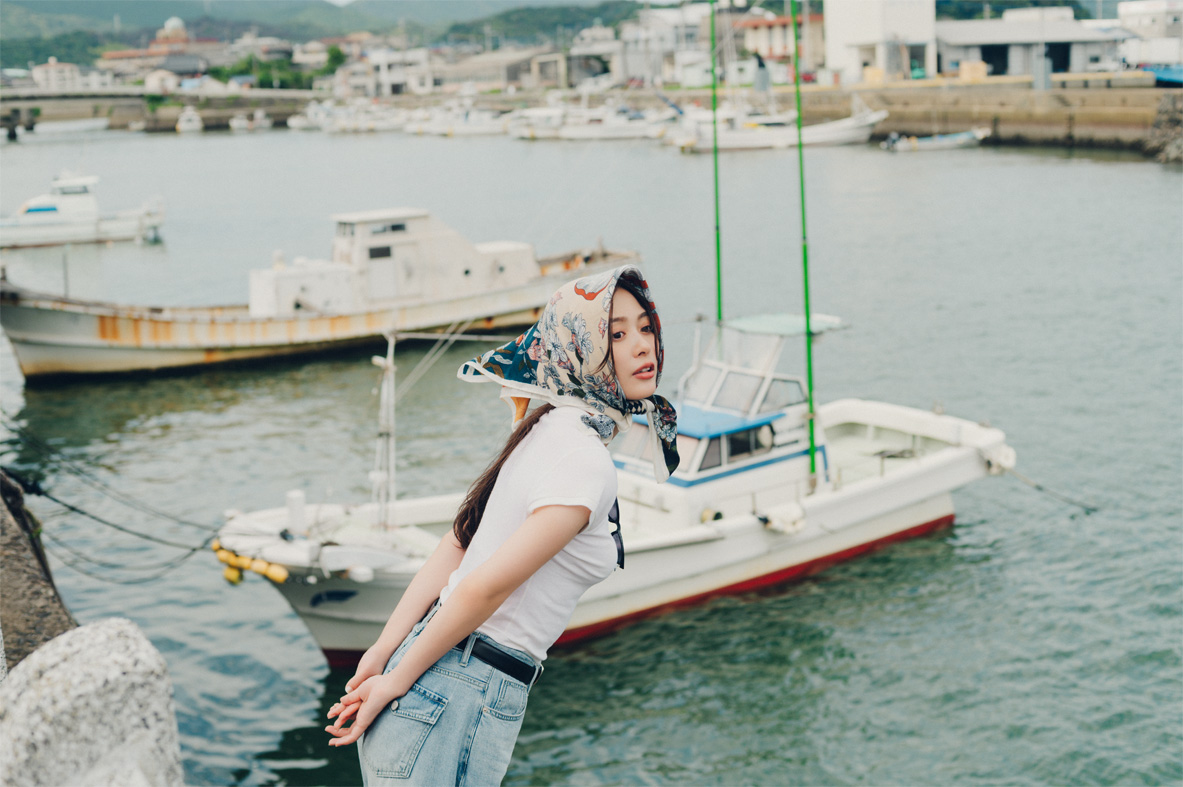 スカーフを真知子巻きにして気分はすっかり港の女。