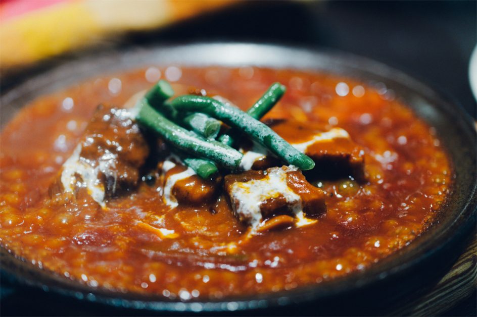 鉄鍋に煮込まれたこれまた美味しそうなビーフシチュー。