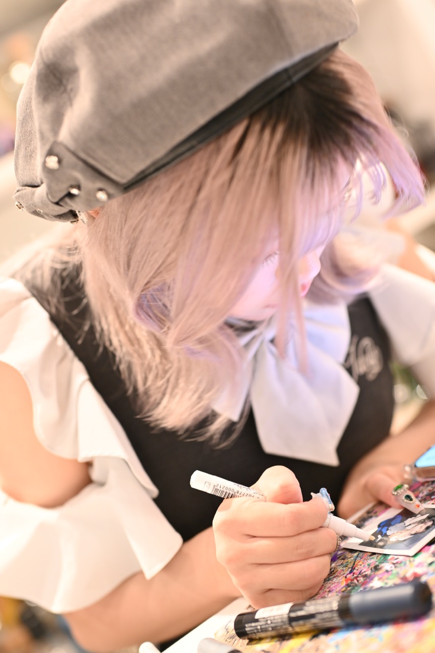 これまで数多のチェキを描いてきた作業ボードは、ペンの跡で埋め尽くされ、まるでジャクソン・ポロックのアクション・ペインティングのようだった。