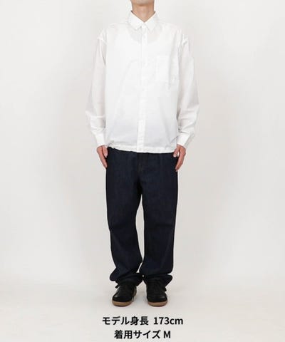 ハリのあるタイプライター素材を活かし、スラックスやワイドデニムと合わせたきれいめカジュアルがおすすめ。裾のスピンドルを軽く絞れば丸みのあるシルエットになり、今っぽいバランスに仕上がります。インナーに白Tを合わせて羽織りとして着るのも◎。足元はスニーカーで軽快に、レザーシューズで大人っぽくまとめてもハマります。
