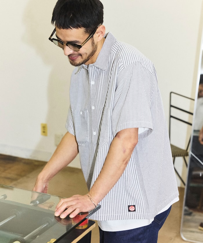 同ブランドの別注PT-38ワイドパンツと合わせたワークスタイルがおすすめ。スラックスやカーゴパンツと合わせて、カジュアルにもストリートにも対応。インナーにプリントTシャツを挟んで羽織りとして使えば、春夏のレイヤードスタイルにも最適。