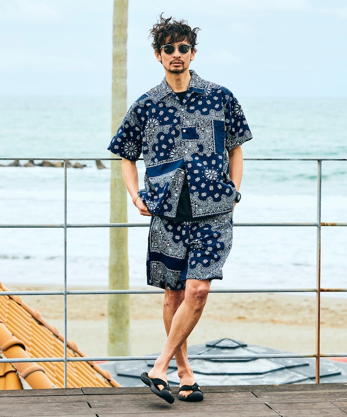 ●同色のバンダナをパッチワーク調にデザインしたオープンカラーシャツ
