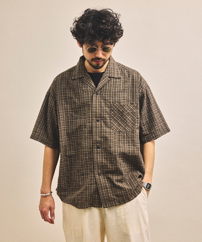 サッカー素材の軽さとチェック柄を活かし、ボトムはワイドチノやデニムでカジュアルにまとめるのがおすすめ。足元は白スニーカーで爽やかに、レザーサンダルを合わせれば大人っぽい抜け感も演出できます。