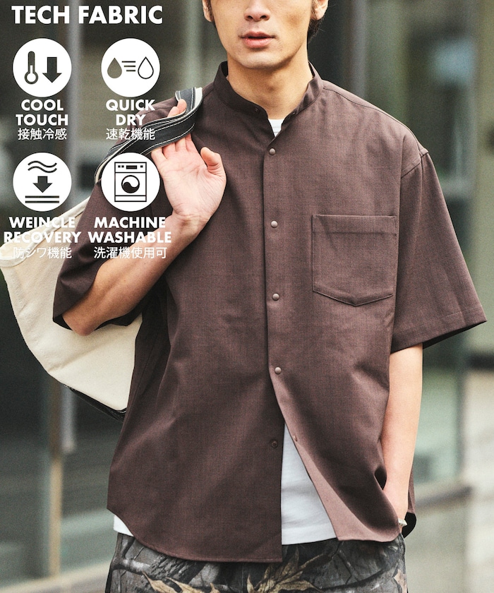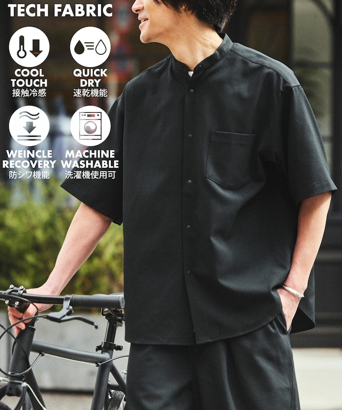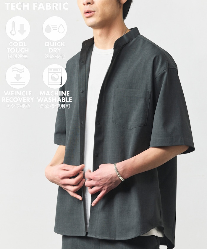 速乾素材 リラックスフィット バンドカラーシャツ ショートスリーブ リネン風