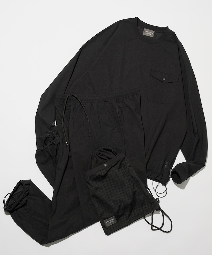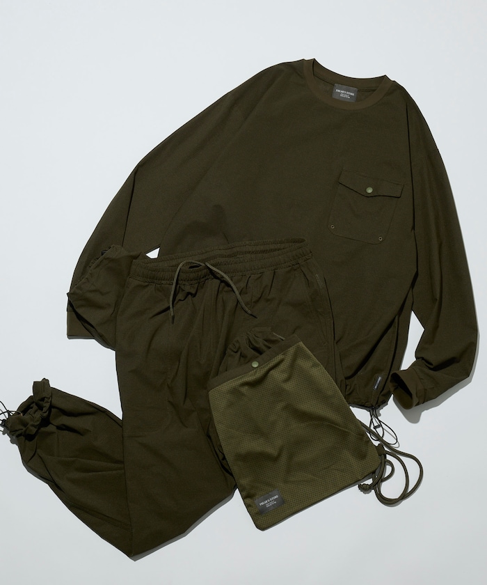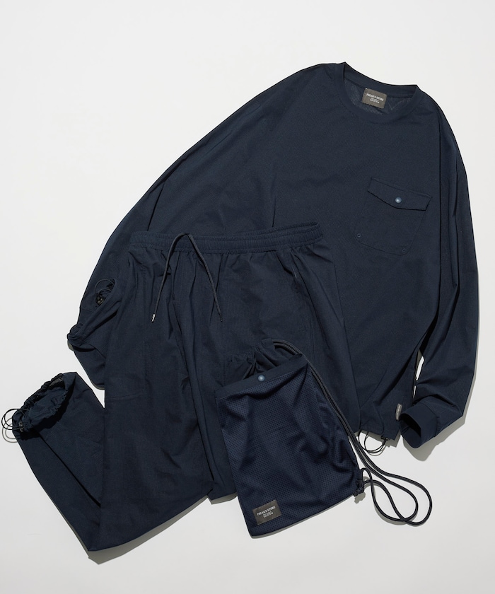 セットアップでの着用はもちろん、単品使いでも着回し力の高いアイテムです。移動の多い日は上下セットで合わせて、足元は軽量スニーカーやサンダルで抜け感をプラスすれば、快適さと大人っぽさを両立したトラベルスタイルが完成します。長袖プルオーバーは裾スピンドルを絞ってシルエットに変化をつけ、ワイドパンツやショーツと合わせるのもおすすめ。パンツは無地Tやシャツと合わせれば、都会的なリラックスコーデに仕上がります。パッカブル仕様なので、出張やワンマイルウェアとしても活躍。付属のミニバッグはポーチ感覚で持ち歩けるため、旅先ではサブバッグとしても便利な万能セットアップです。