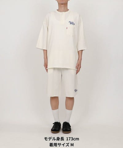 ●SAUVENIRのシグネチャーアイテム「オールナイトサウナ」ロゴを刺繍したカプセルホテルやスーパー銭湯でよく見られる館内着(かんないぎ)をイメージしたセットアップ