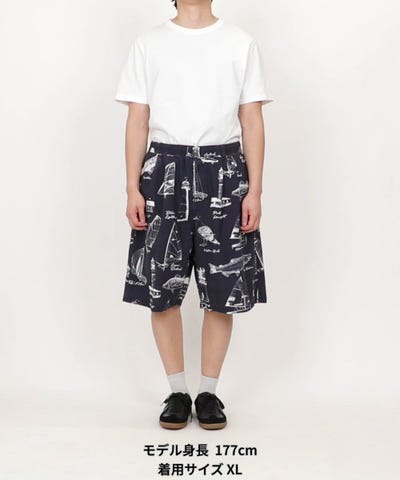 灯台・鳥・魚などのOCEAN総柄がしっかり映えるショーツなので、トップスは無地で引き算するのが鉄板です。白TやネイビーのTシャツ、無地のポロシャツを合わせるだけで、柄の存在感が活きた夏らしいスタイリングに仕上がります。ツータック入りで程よく上品さもあるので、シャツを羽織ったり、リネン素材のトップスを合わせてリゾート感のある大人カジュアルにするのもおすすめ。足元はスニーカーやスポサンでアクティブにまとめても良く、レザーサンダルやローファーを合わせれば街でも浮かないきれいめミックスが楽しめます。仕上げにキャップやサングラスなど小物を足すと、夏のムードがさらに高まります。