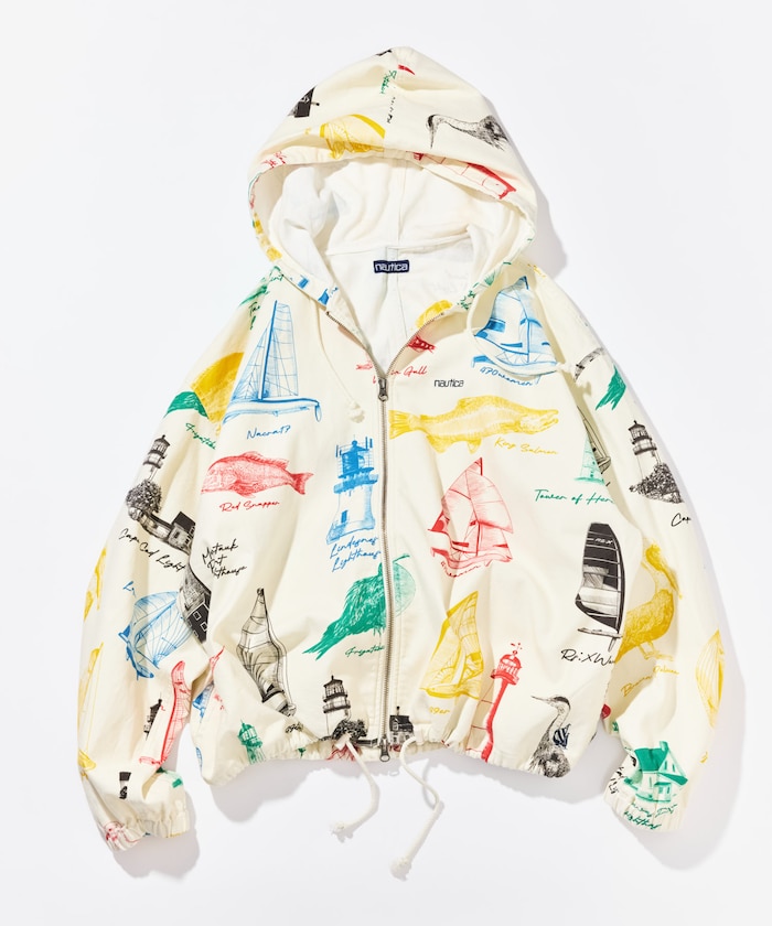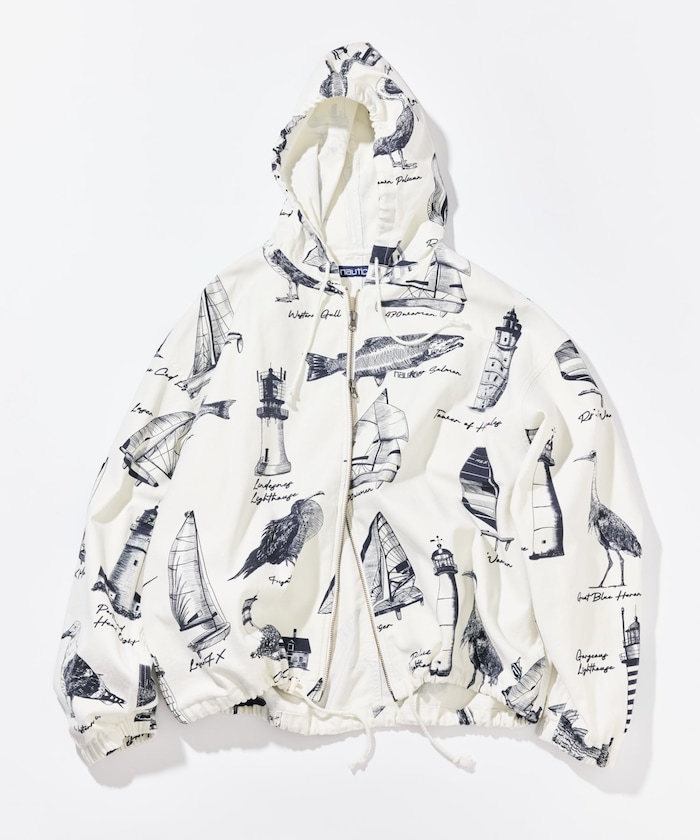 ●灯台・鳥・魚など、アメリカ発祥のNAUTICAらしいモチーフを落とし込んだOCEAN総柄フードブルゾン