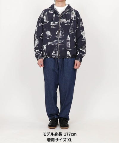 灯台・鳥・魚などのOCEAN総柄が主役になるブルゾンなので、合わせは無地アイテム中心にまとめるのがおすすめです。トップスは白Tやスウェットで抜け感を作り、ボトムはデニムやチノ、ワイドスラックスなどベーシックな一本を合わせるだけでコーデが完成します。ゆったりシルエットなので、インナーにパーカーやニットを入れてレイヤードしてもバランスが取りやすく、裾スピンドルを絞れば丸みのあるシルエットで今っぽい着こなしに。足元はスニーカーで王道カジュアルに、ローファーやレザーシューズで締めれば総柄を大人っぽく着こなせます。