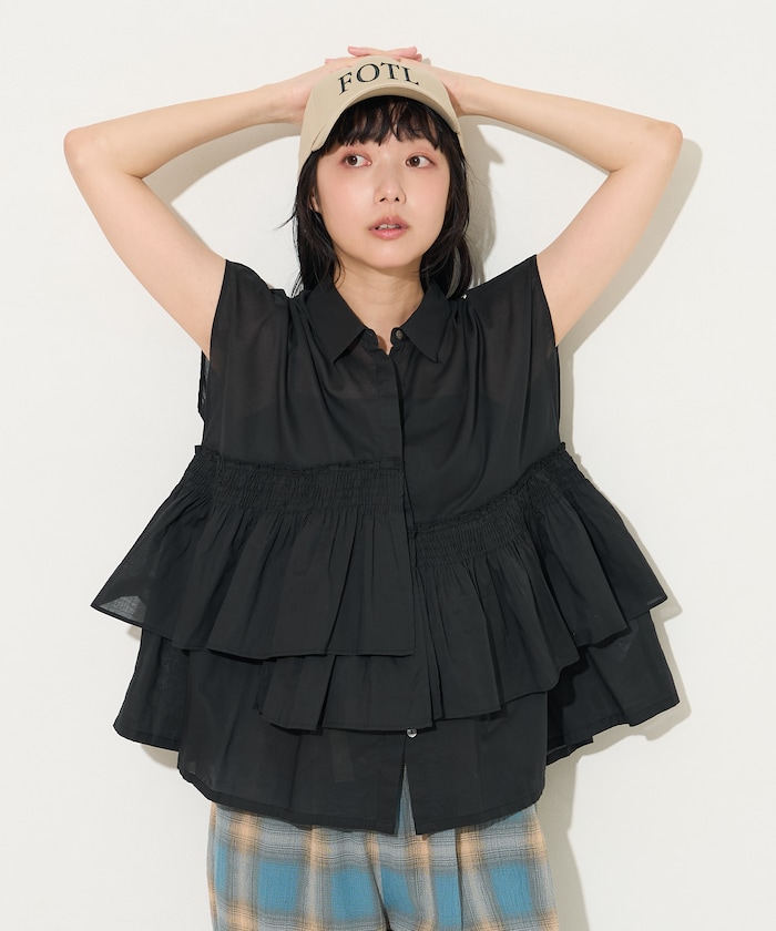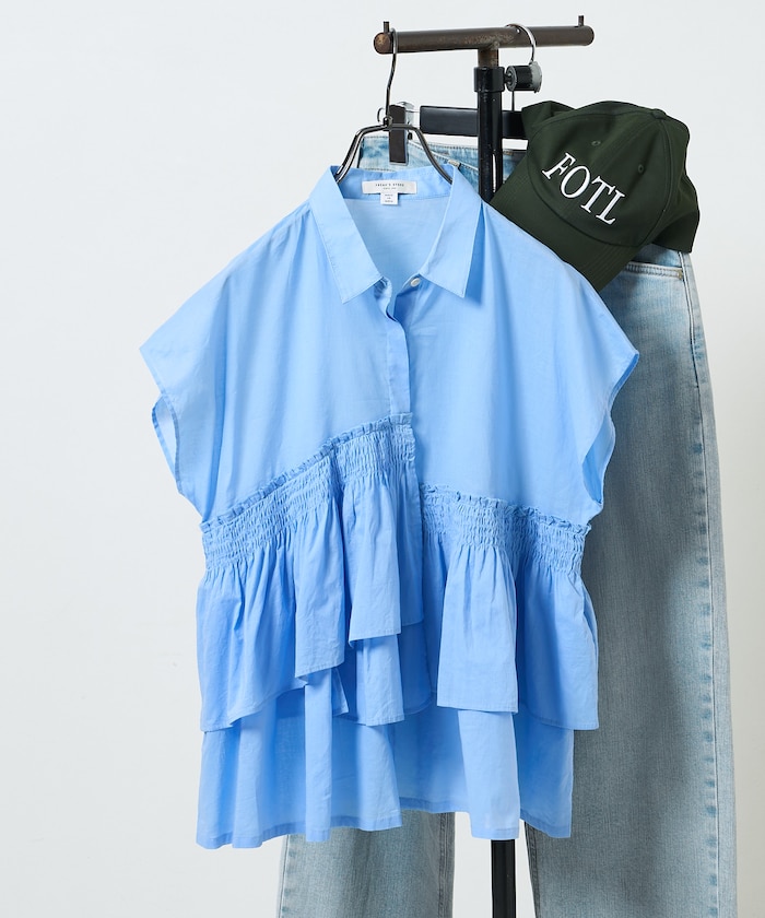 フリルが印象的なのでベーシックなボトムにあわえるだけでコーディネートが完成します。