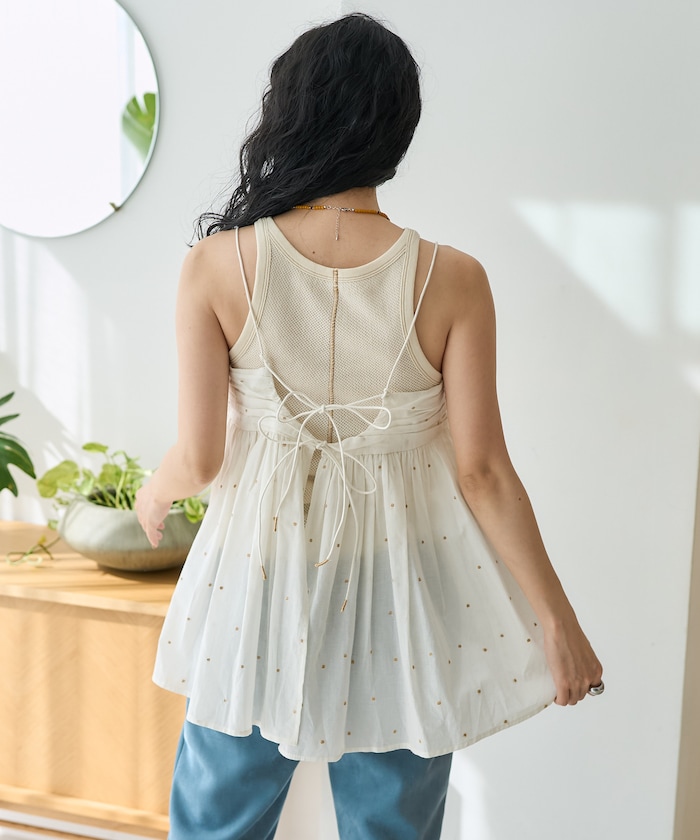 ドット刺繍がさりげなく輝く、大人可愛いバックオープンキャミソール