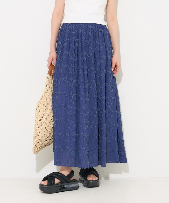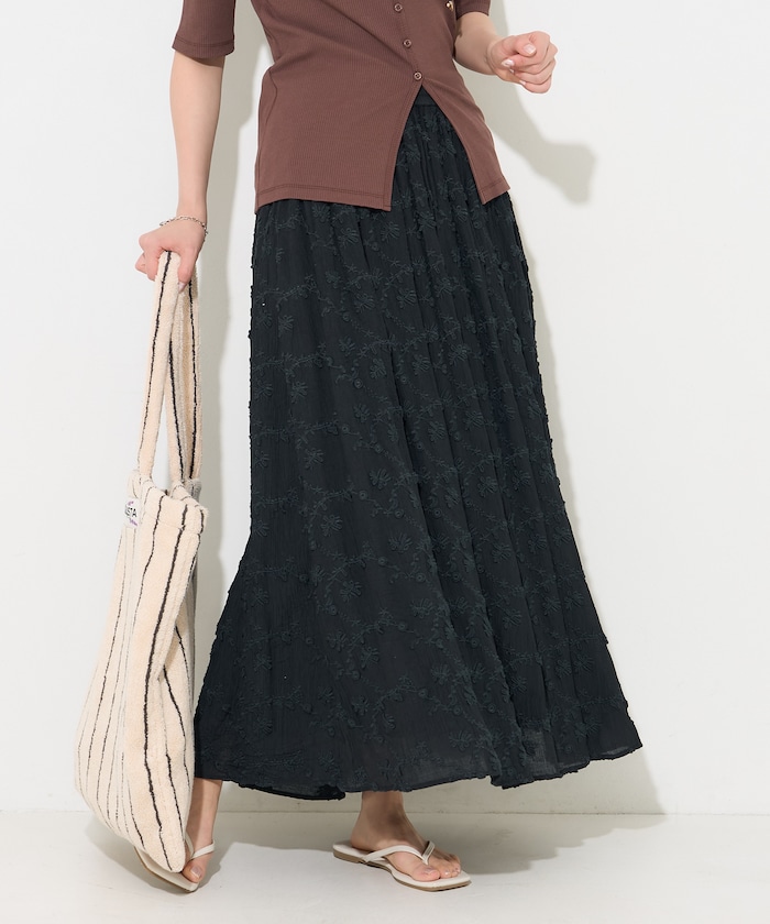 3Dの立体刺繍フラワーがスタイリングを華やかに見せてくれるスカート