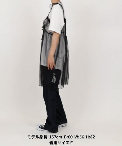 プリントTにデニムパンツなどのカジュアルなスタイリングに重ねてトレンド感がアップするチュールワンピース。