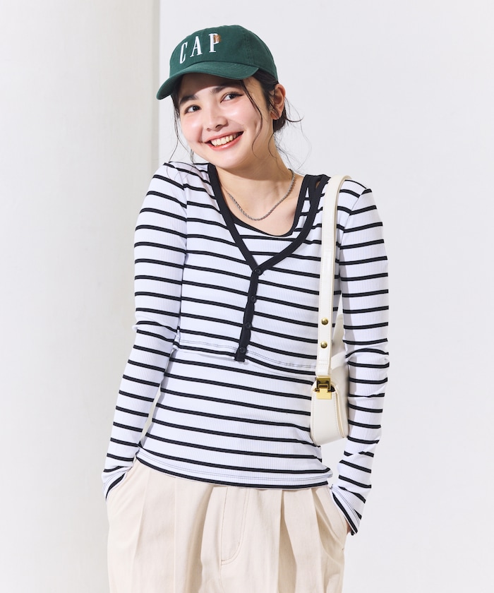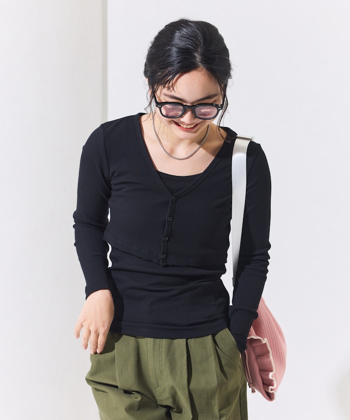 ●ショート丈カーデと同素材タンクのセットなので、レイヤードが簡単に決まり統一感のある着こなしが完成します