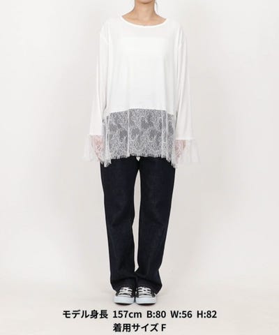 ●カットソー素材のシンプルなロングスリーブTシャツに、裾と袖口部分だけレースやオーガンジーをドッキングした異素材デザインのトップス