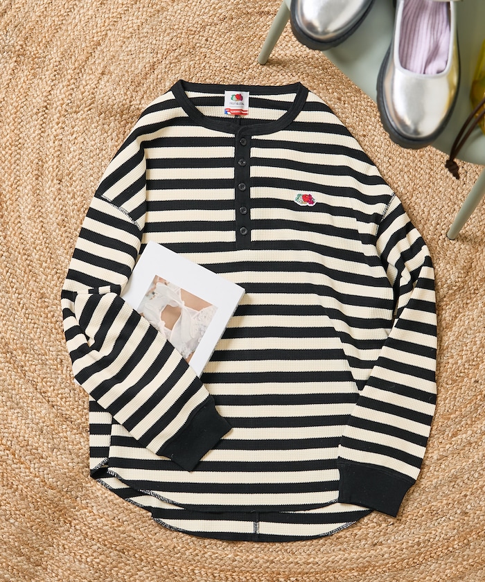 ●程よく抜け感を演出してくれるヘンリーネックで、1枚でもレイヤードでも活躍