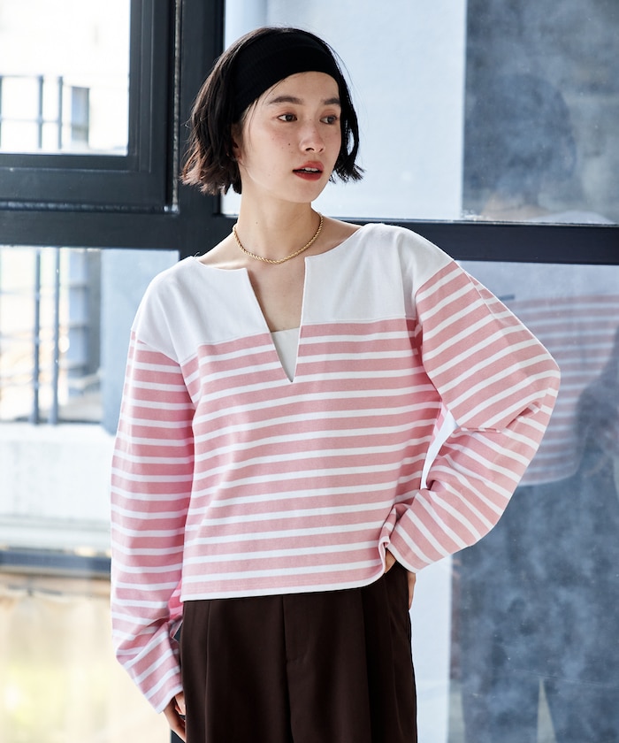 ●深めのVネックが顔まわりに抜け感を生み、大人っぽい印象に