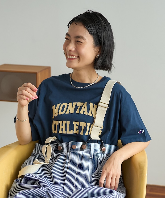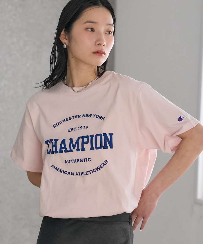 ●Championらしいカレッジ風ロゴをあしらった、別注デザインの半袖Tシャツ