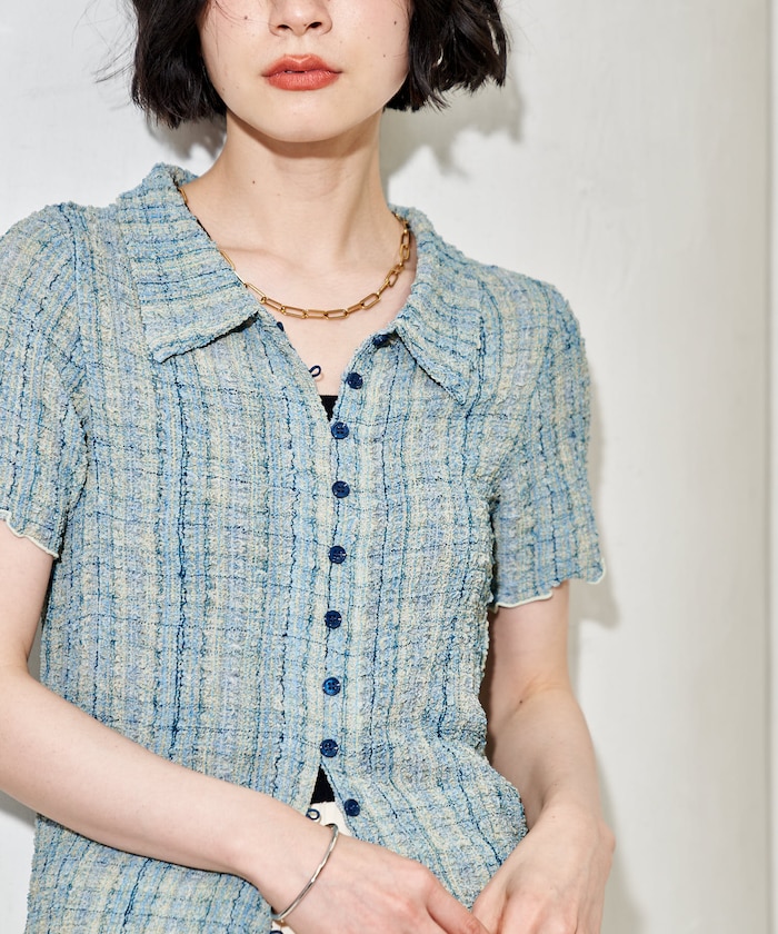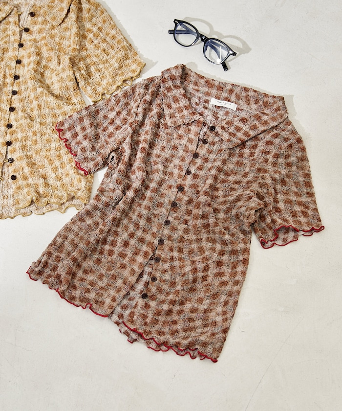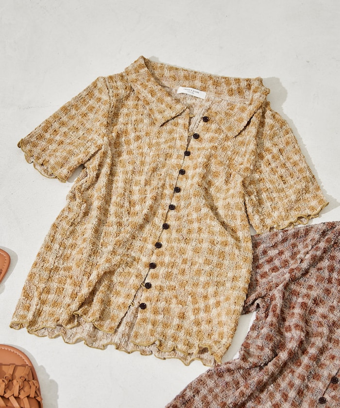 ●凹凸感のある“ポコポコ”素材が目を引く、表情豊かなチェック柄ブラウス