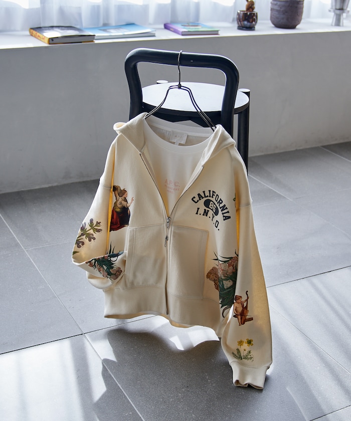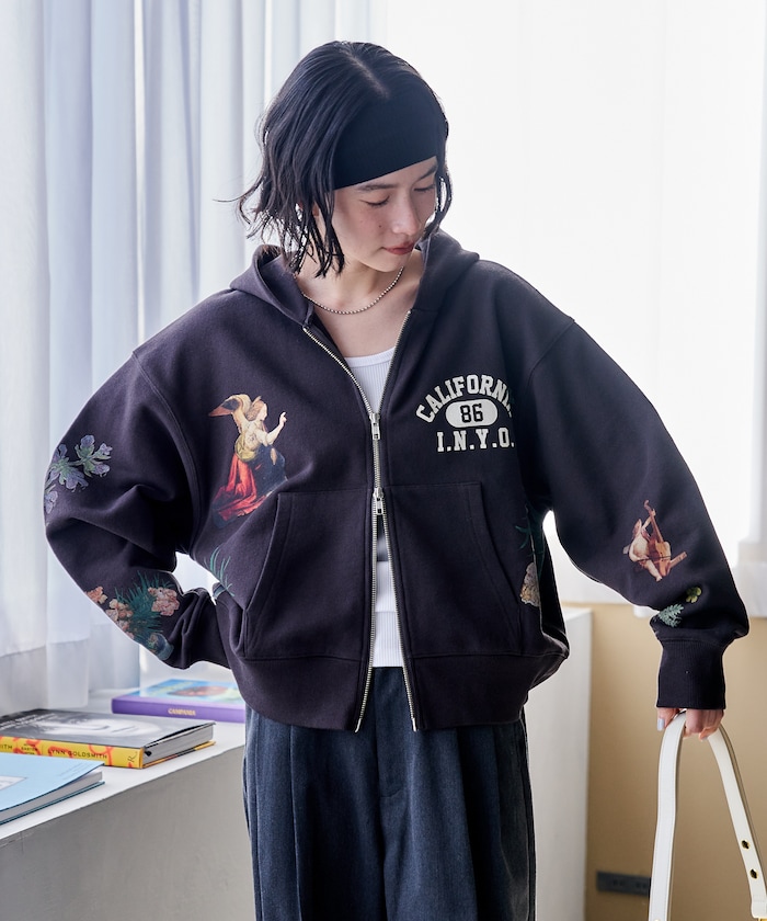 ●フロントからバック、袖にまで配された絵画プリントがシンプルなジップパーカーに奥行きをプラス