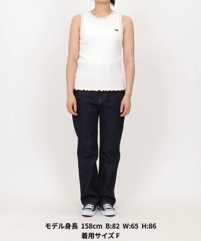 ●裾にあしらった配色メロー仕様や襟ぐりの配色ステッチがポイントのタンクトップ