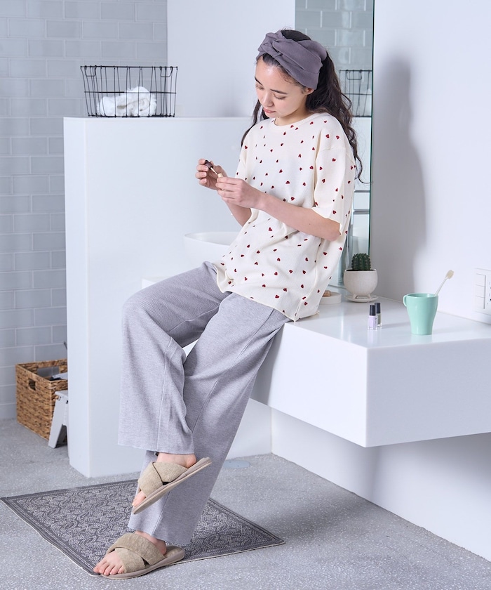 ●ハート柄半袖ワッフルTシャツとロングパンツのセットアイテム