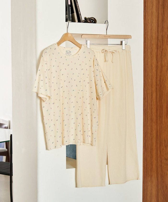●全体に散りばめた小花プリントのTシャツと、無地のリラックスパンツ