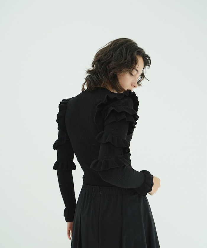 フリルとタイトシルエットが映えるフェミニンニットトップス