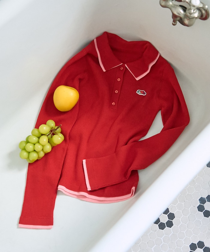 ●襟、袖口、裾に配色ラインを効かせた、クラシックさと可愛らしさを兼ね備えたニットトップス