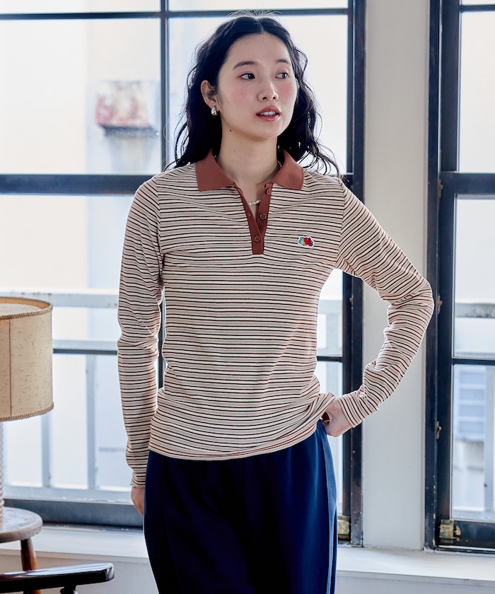 ●春夏らしいマルチボーダー柄に、コントラストの効いた配色襟がポイントのポロトップス