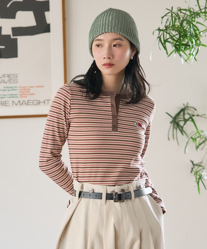 大人の抜け感を演出するヘンリーネックリブロンT