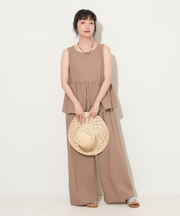 ●ペプラムトップスとパンツのセットアップに見えるサロペットデザイン