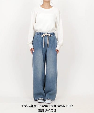 ウエストゴムでゆったりと楽に履けます。 裾が少し私には長いので、シューズによってはウエストを少し折っています。 デニムの良い色落ち感もとても気に入っています。 着回しが幅広くできるのでオススメです!
