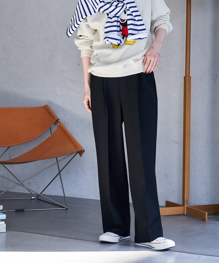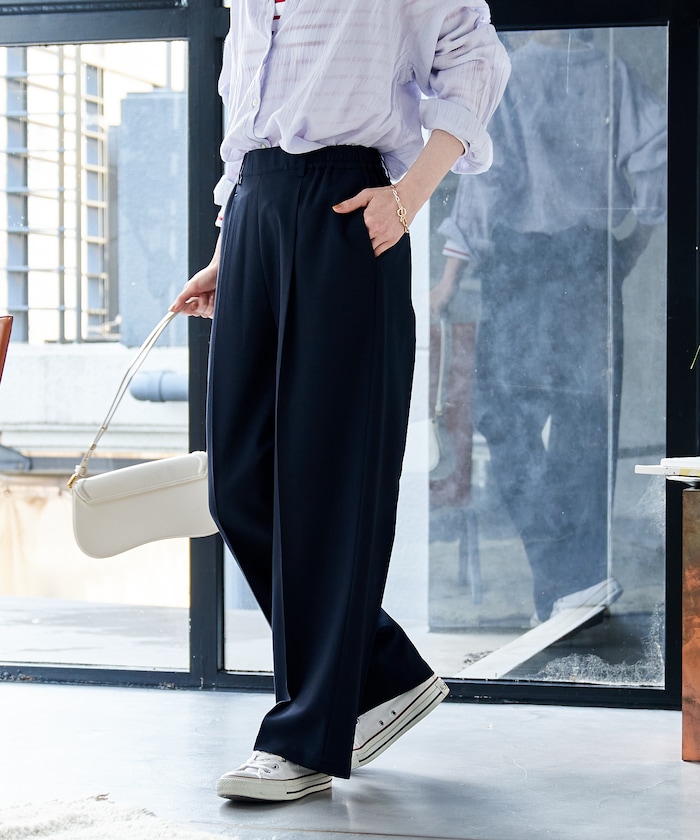 ●タックとセンタープレスを入れすっきりと綺麗な見た目ながら、ウエストゴム仕様で履き心地の良さも両立