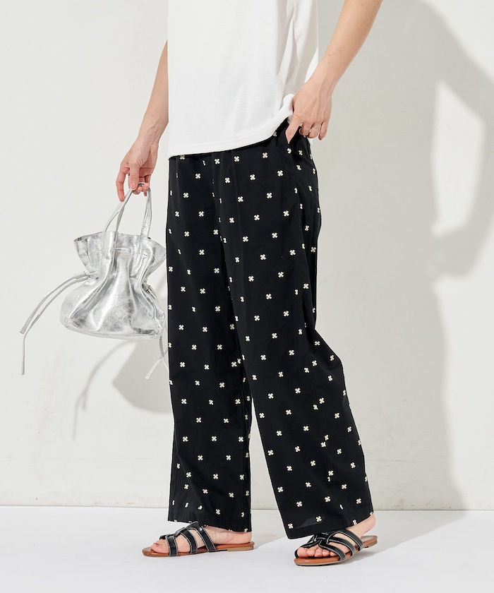 ●夏らしいコットン素材に総柄刺繍を施したイージーパンツ