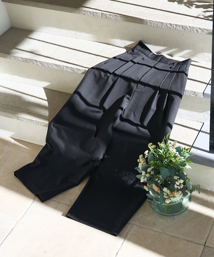 ●ウエスト部分に施した2タックが、すっきりとした腰まわりを演出し、トップスインもきれいに決まります