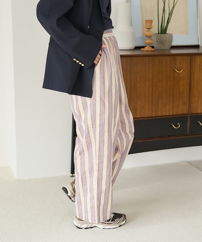 ●夏らしい爽やかなストライププリントが目を惹く、インド製イージーパンツ