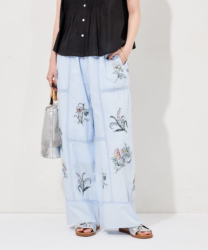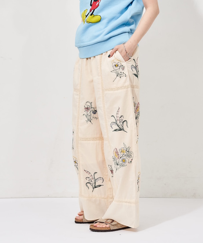 ●ヴィンテージファブリックをイメージした、繊細な刺繍が目を惹くイージーパンツ
