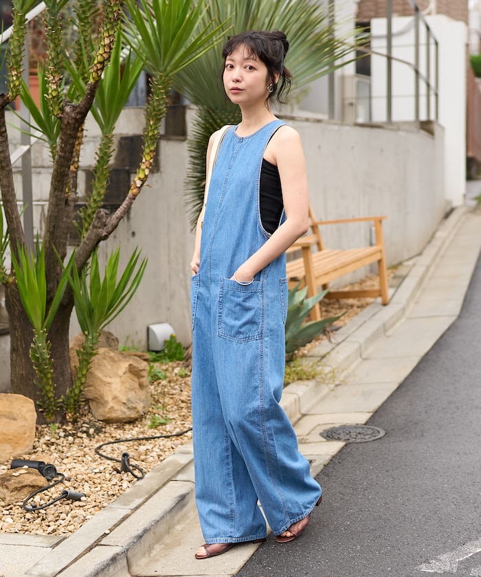 ●アメスリデザインで、肩まわりをすっきり見せてくれる大人なデニムサロペット