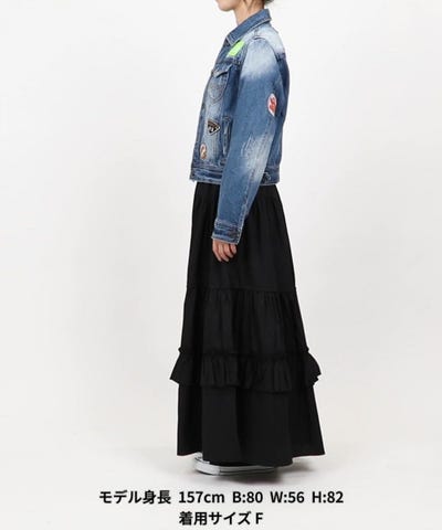 程よいダメージとワッペンが華やかで、コンパクトながらも身体のラインを拾う事なく着られます。冬はコートのインナーとしても活躍出来そうです。