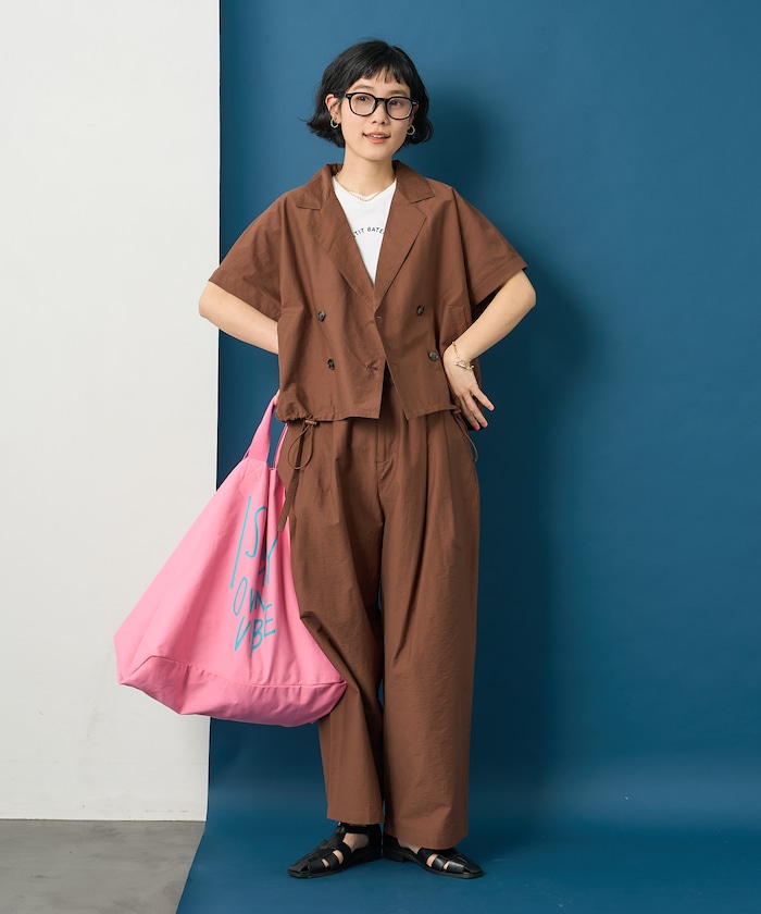 同素材のパンツとのセットアップ着用でオンスタイルはもちろん、手持ちのブラウスやTシャツに合わせれば簡単にきちんと見えします。