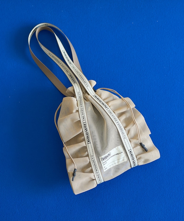 ●BROWN定番のシューズバッグを春夏らしいメッシュ素材に別注し、アクティブは印象ながらフリルデザインがキュートなバッグに仕上げました