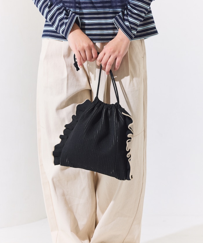 ●大胆に施されたフリルが女性らしさをプラスする巾着バッグ
