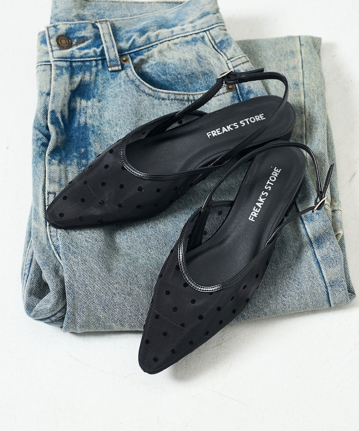 ●透け感のあるドットチュールが足元に抜けをつくるストラップパンプス