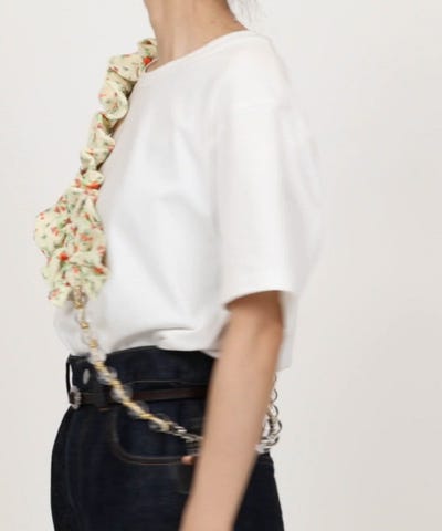 凹凸のあるジャガードにプリントを重ねて、フリルに仕上げたインパクトのあるスマホショルダー