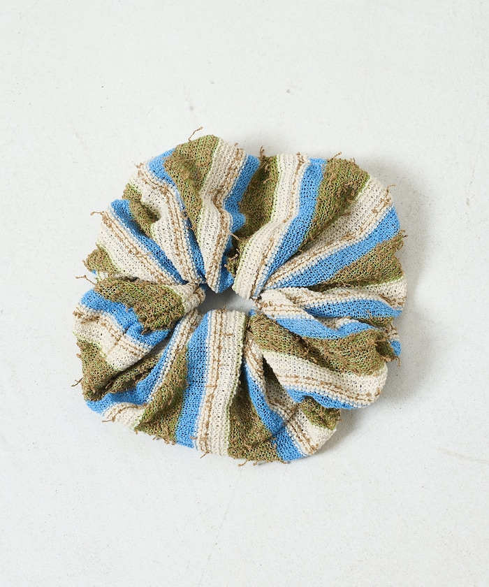 ●ざっくりとした編み地に、配色ストライプが映える柄と、フェミニンな雰囲気のドット柄の大ぶりシュシュ