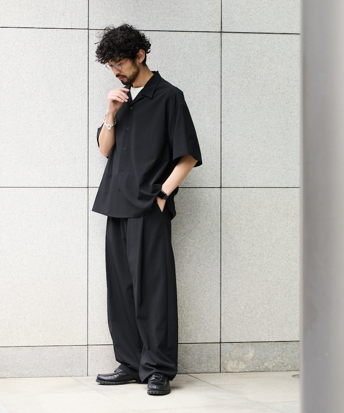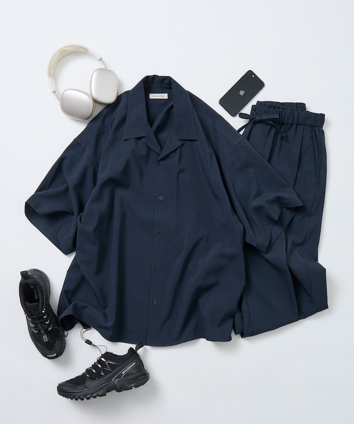 ●シャツは適度なビッグシルエットのオープンカラーで、リラックス感とストリート感の共存するシンプルな作り