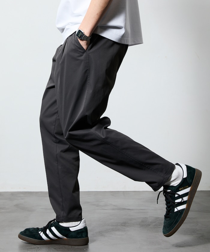 ジャストレングスのテーパードシルエットの為、様々なアイテムとのスタイリングが可能です。シャツやジャケットといったベーシックなトップスはもちろんの事、ストリートテイストのアイテムとの相性も良く、飽きの来ない1本となっています。