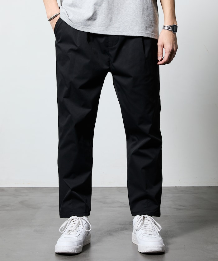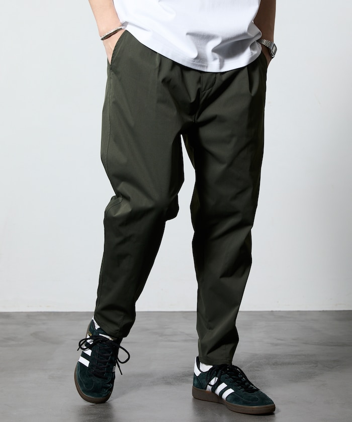 ●適度なハリ感と滑らかさのあるポリチノ素材を使用した、履き心地抜群のテーパードパンツ