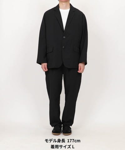 ●トップスはベーシックな2ボタンのテーラードジャケット、サイズはゆとりが嬉しいリラックスフィット
